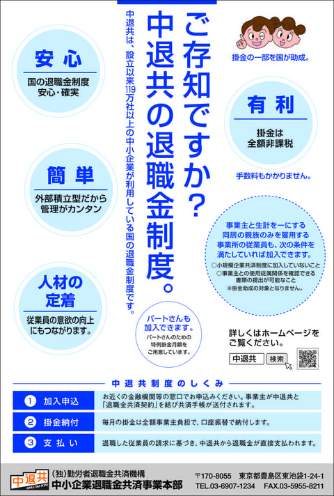 この制度は、掛金の一部を国が助成するほか、管理も簡単で、税制上の優遇措置が受けられるなどのメリットがあります。詳細は中小企業退職金共済事業本部ホームページへ